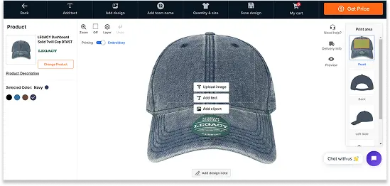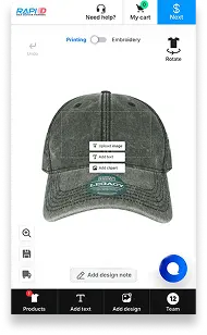 Add your logo, text, or artwork easily. Upload your own design or use our simple custom baseball hat maker to create something unique.